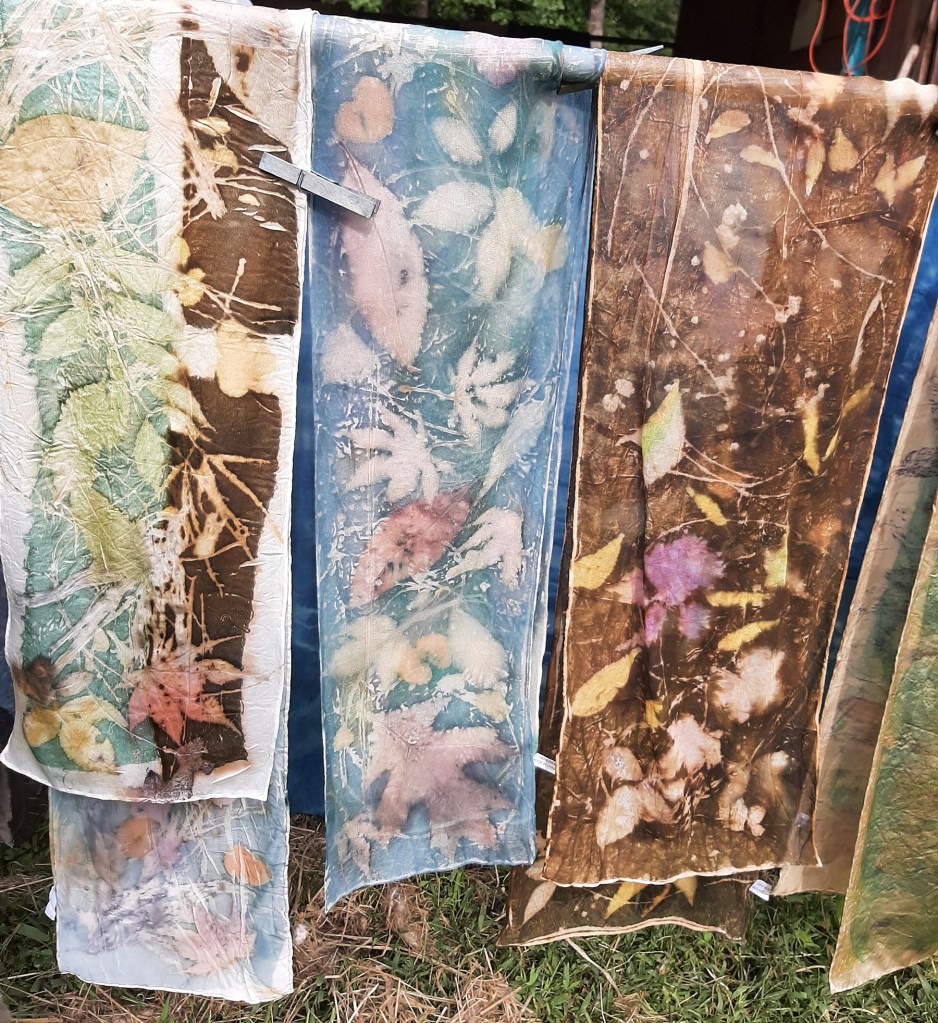 Discoveries in Ecoprint Class – In this class we will dive a little deeper into different materials and effects you can achieve and use with ecoprint. Learn to dye 2 silk scarves (chiffon and satin), a long linen table runner as well as two cotton tea towels. Learn about the different mordants and preparation for each type of fabric. We will also experiment with dyed ‘blankets’ that will dye the material around the leaf prints. While our creations are steaming, we will enjoy a yummy farm to table style lunch, then take a walk in the woods and learn to identify different trees by their bark and leaves and discus how they print during the ecoprint process.