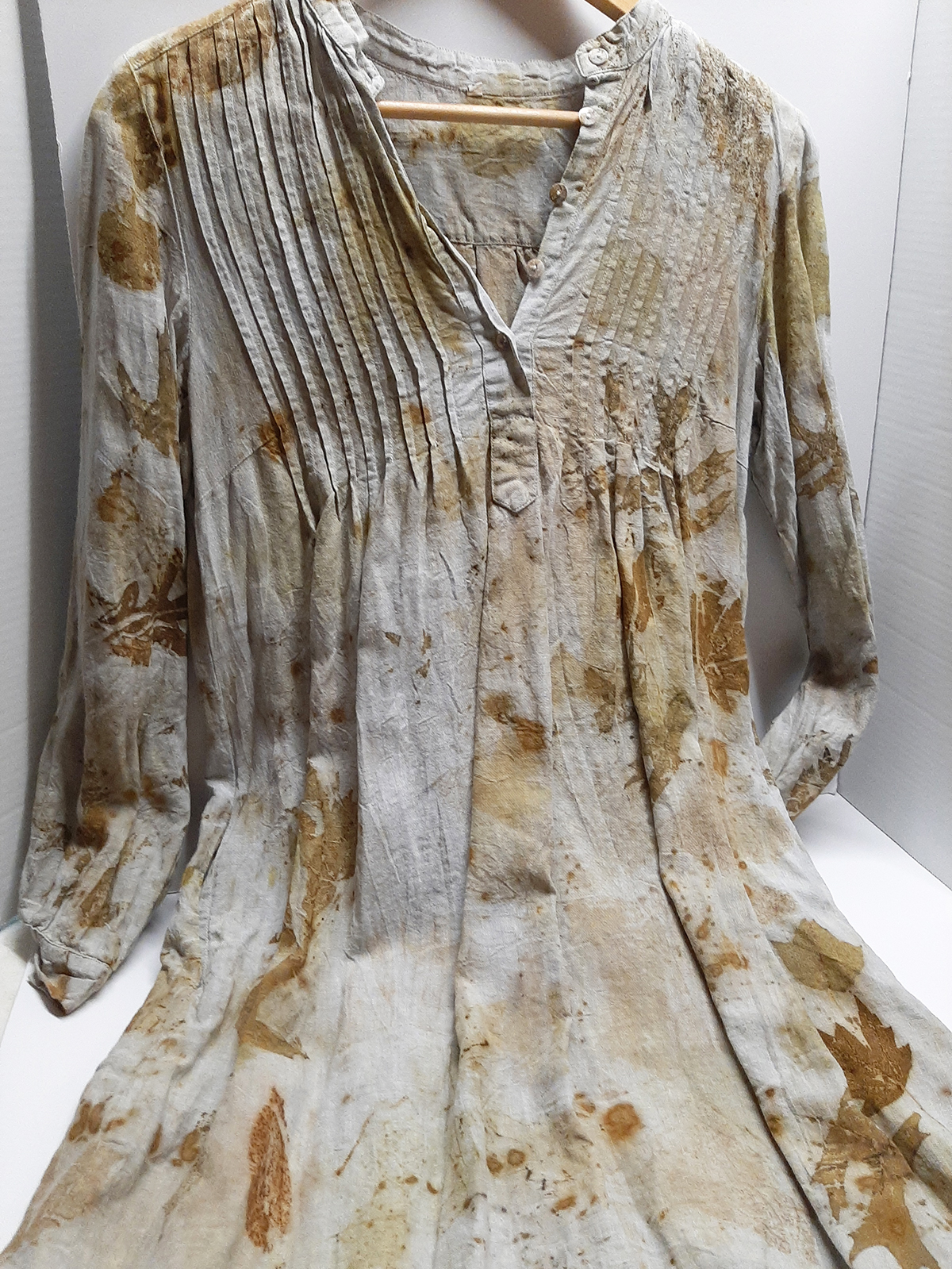 We learn to ecoprint on larger items in this class as well as learning the different mordants needed for different natural fabrics. You will ecoprint three to four larger items such as a tunic, shirt, dress or skirt. We will supply a list of places you can purchase linen, hemp, wool or cotten blanks to be dyed, or you can choose to dye something you already have in your closet as long as it is a natural fiber fabric (either protein or cellulose, no synthetics) and is a light color, it will work. Once you purchase/know what you are dying, you will either need to bring the pieces to me to pre-pre-mordant or I will give you instructions on how to pre-mordant your items before the class. Some mordants take a full week to cure, so it is important that you find/purchase your pieces well in advance. Photos coming soon!