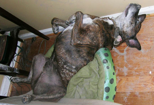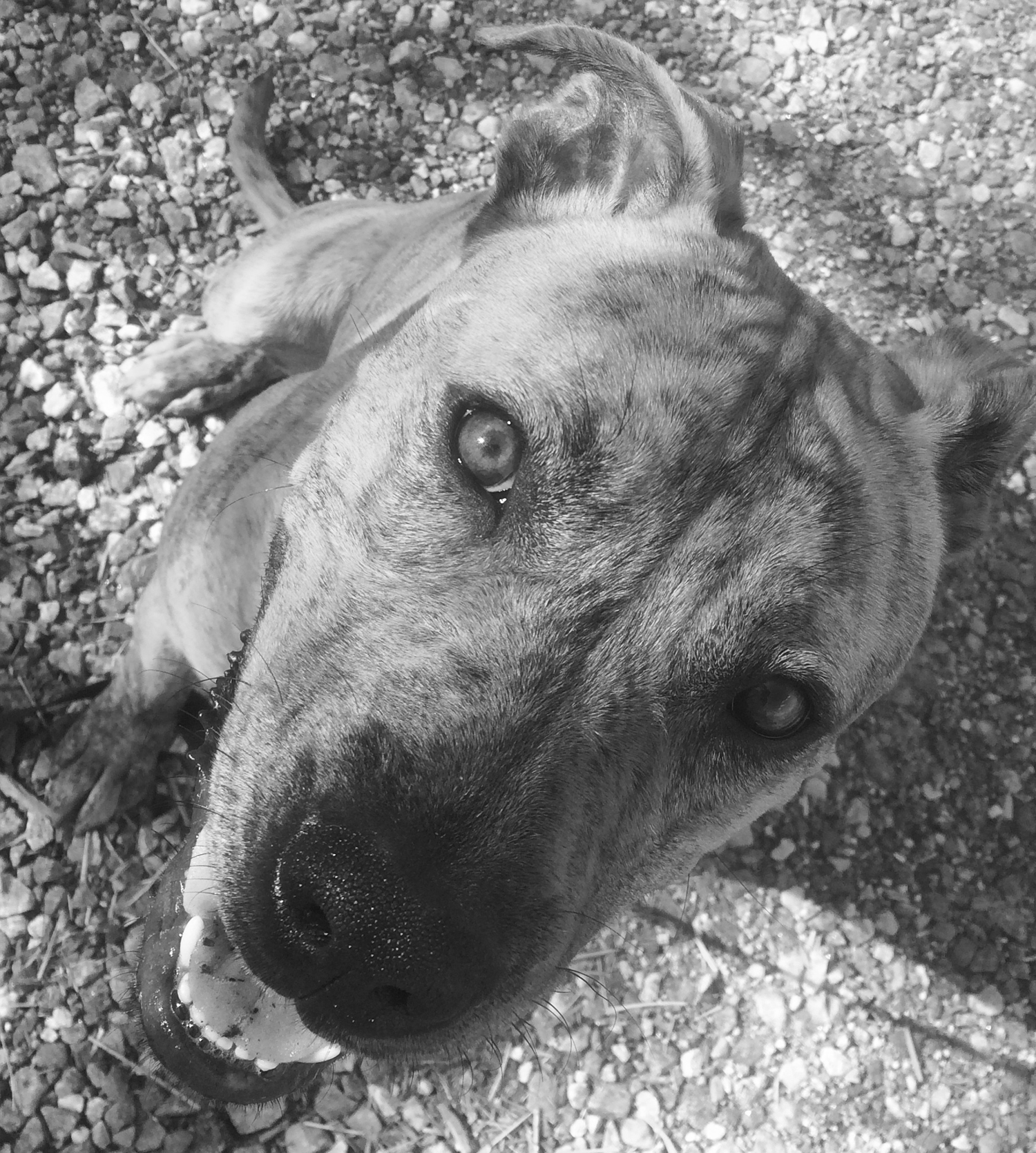 Pumpkin Butt (aka: Moonshine, Shiner, Shunshine, Gator face). Is with out a doubt the funniest dog we have ever adopted. He is a real piece of work. Always has to have the last word. Such a loud mouthed love bug, this one!