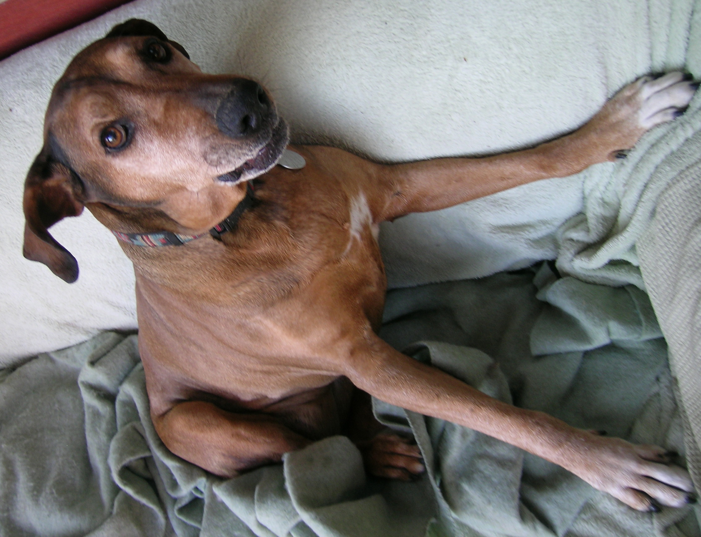 Meet Penny Roo. We just recently adopted Penny Roo through the Rhodesian Ridgeback Rescue. She had three legs when we adopted her. Her history is unclear as to what happened. It is suspected that is was a car accident, but we are not sure. Shhhhh….don’t tell her she only has three legs, I don’t think she knows!