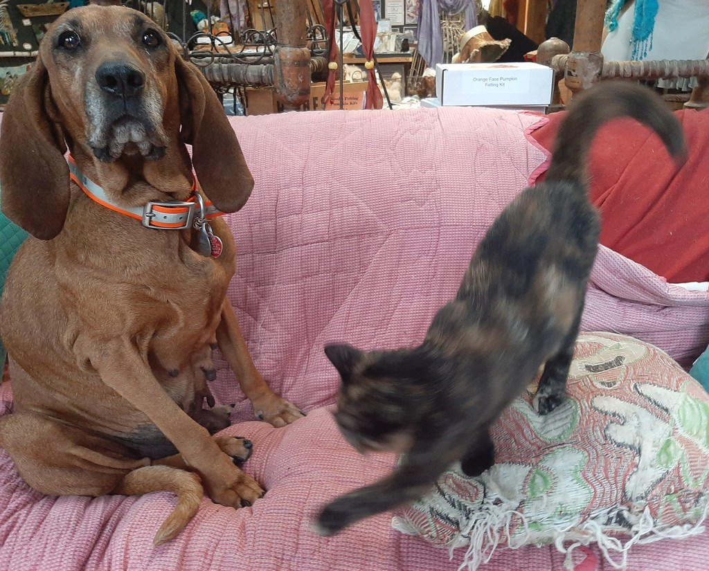 The minster that hosted Pops funeral found Peas wandering in their yard, looking like she had recently dropped some pups. They tried to find her owner, but without a collar or a microchip, no luck. They were looking for a home for her since they couldn’t keep her. It took one look at her and we were SOLD. She is such a goofy hound, full of personality. Unfortunately as I write this she is still battling heart worm and the Doc found a large tumor on her spleen when he spayed her. The tumor looked like it hadn’t spread, but being an older dog (at least 8 – 10) with her heart worm condition he didn’t feel it was a good idea to try to remove it. So we will enjoy Pass the Peas as long as god allows us. She is our little cartoon dog. Update: Unfortunately Pass the Peas passed from canser and only was with us for a very short time.