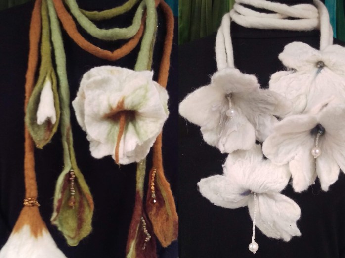 Learn to felt make three types of flowers and leaves on a fiber necklace. For more information on the Wet Felted Flower Class, click here.