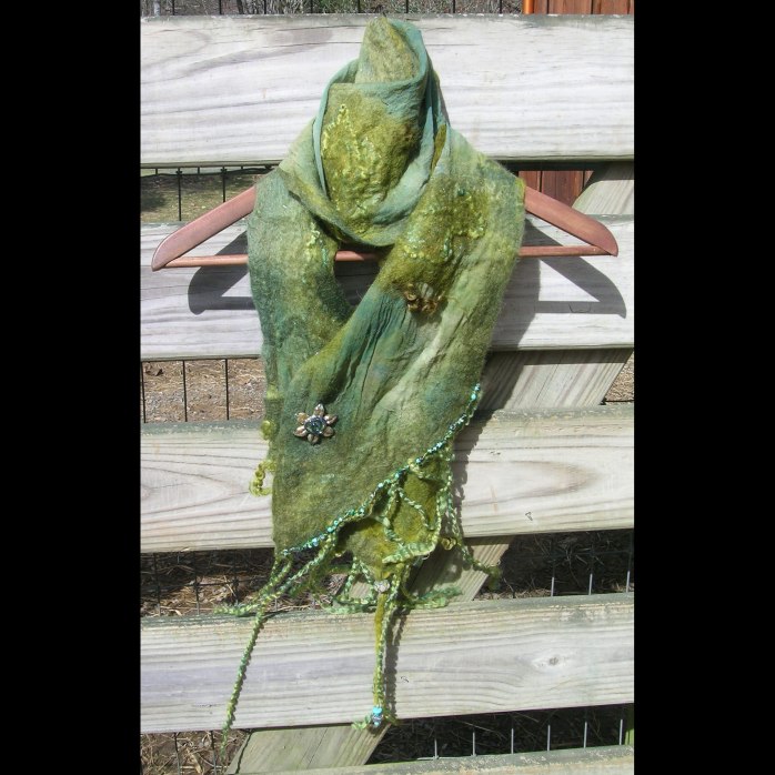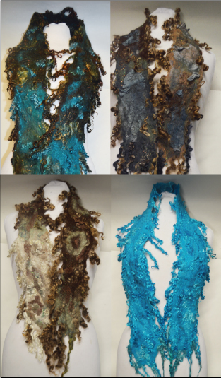 Texture, texture and more soft texture added to the fun wet felted alpaca scarf. For more information on the Lots of Locks Scarf Class, click here.
