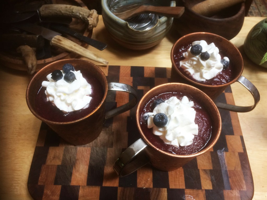 VERY IMPROTANT: pour in copper mug top with a dollop of whip cream, add two fresh blue berries, a thin slice of lime and chocolate mint leaf.