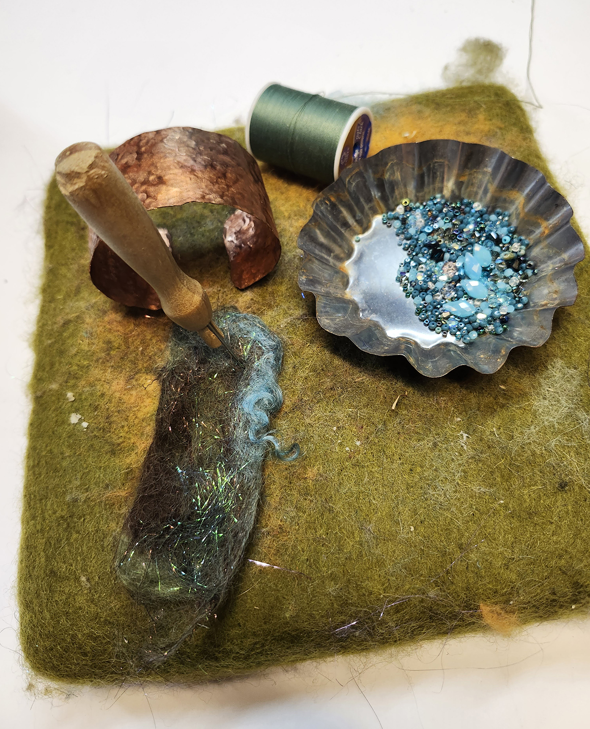 We will torch our copper in the heat of my lampwork flame to create golds, ruby and orange colors before we learn to felt a piece of cloth to cover the front of the bracelet with soft alpaca fiber.
