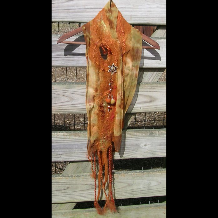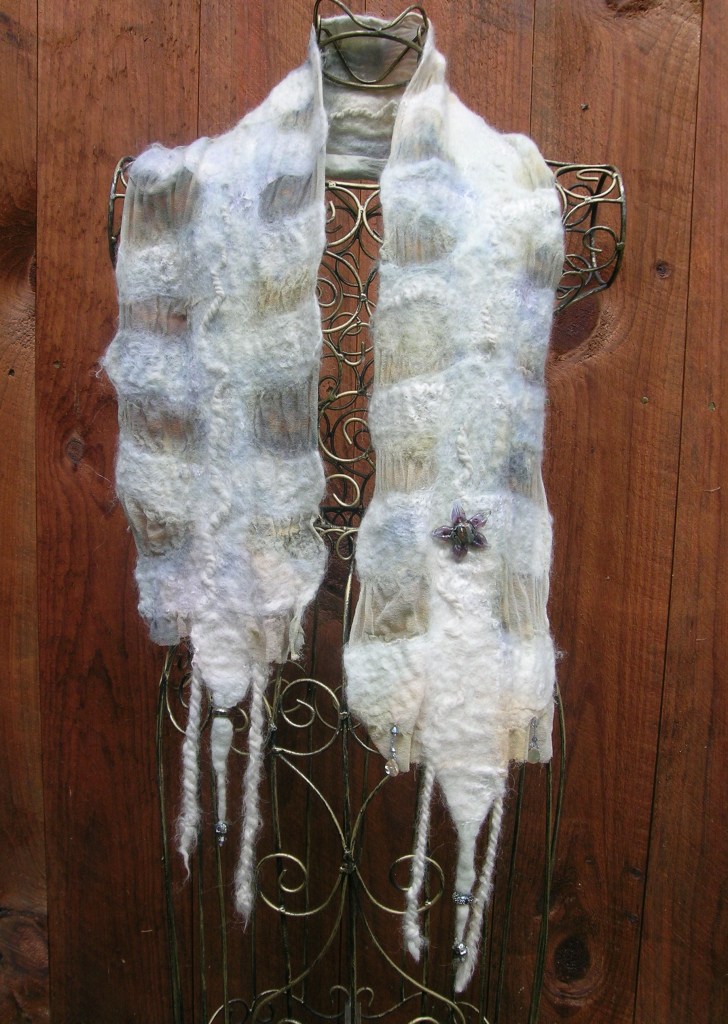 You choose from a seemingly endless collection of hand dyed silks and alpaca rovings. No two scarves ever turn out the same. The process of wet felting all the textures together creates a unique, soft, very wearable fabric.