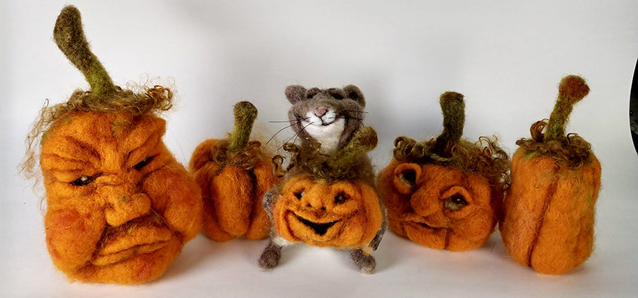 Learn to needle felt several different size pumpkins with different facial expressions. This is a great way to learn to do felted faces that can then be applied to dolls or other creatures in the future. What’s the secret to making a face with different expressions? We will cover several techniques to help you create funny, sad, happy or even wicked little pumpkins.
